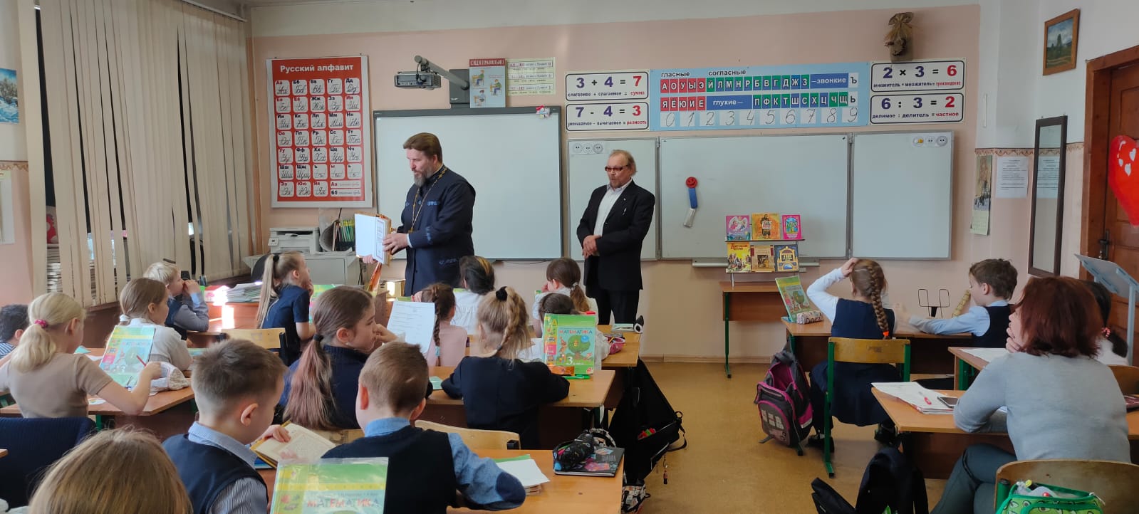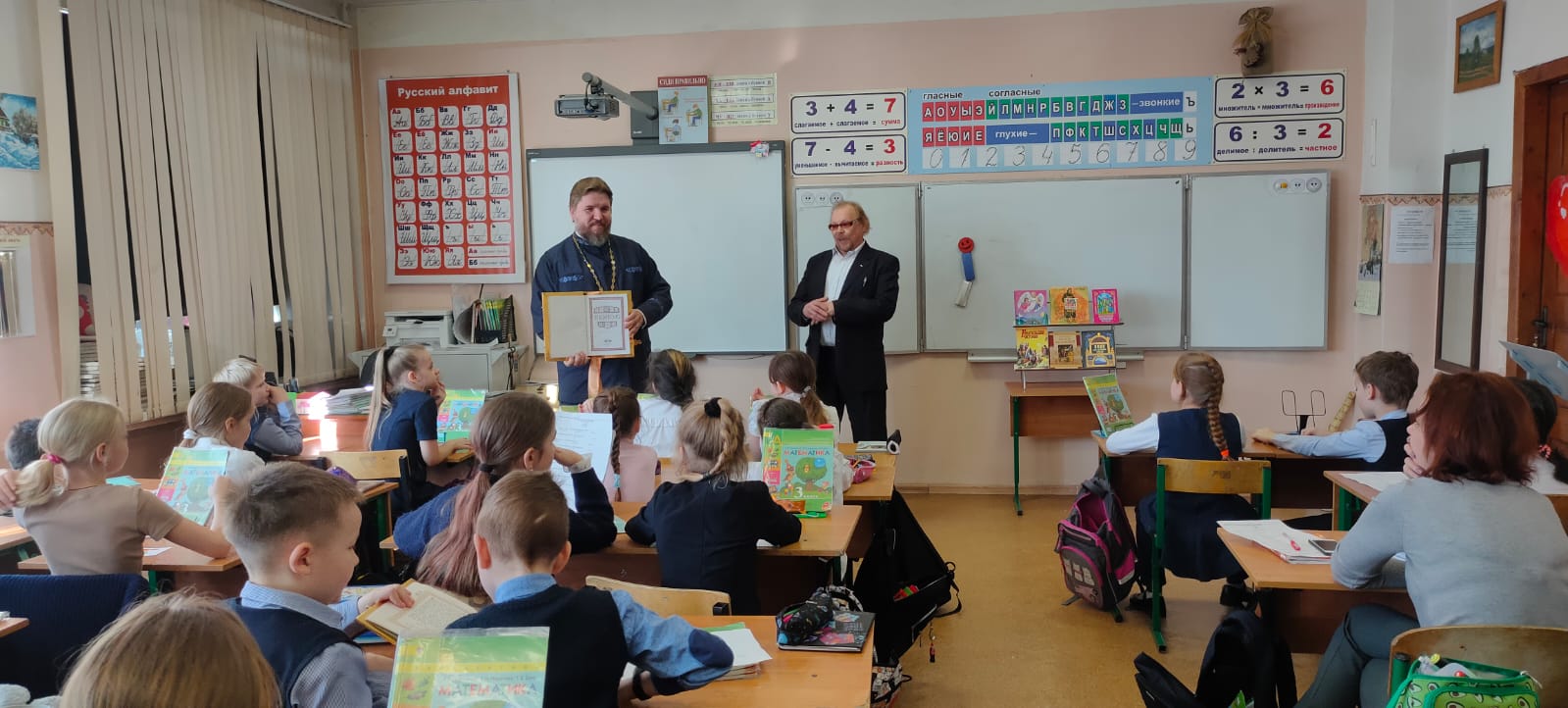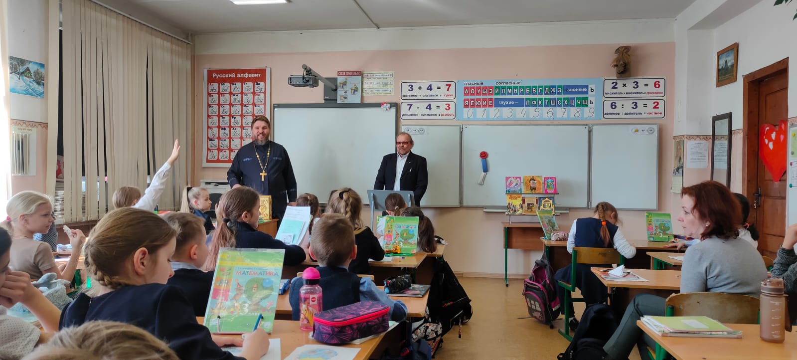 23 марта 2023г. в рамках празднования Дня Православной книги совместно с МУК ЖМЦБ им. Н.Н.Ремизова иерей Александр Гольцов настоятель храма Тихвинской иконы Божией Матери в г. Жуков и преподаватель воскресной школы Нежданов Игорь Александрович, встретились с учениками 3 А класса МОУ СОШ № 1 им. С.Ф.Романова.