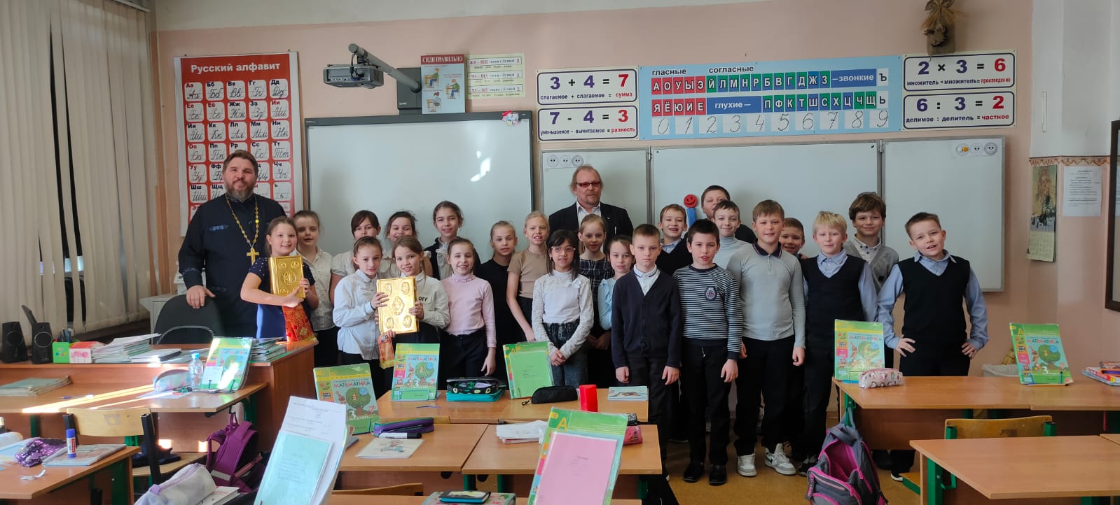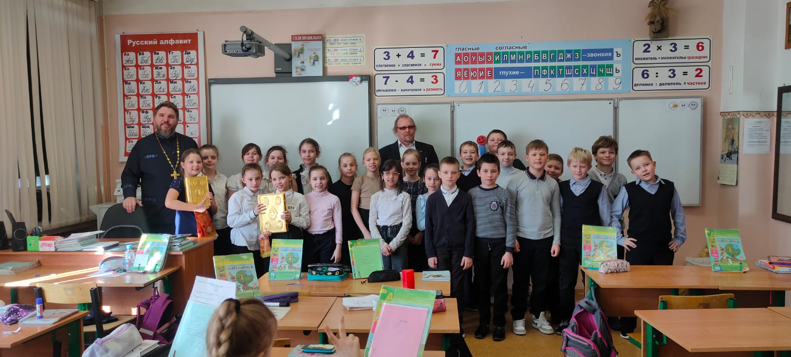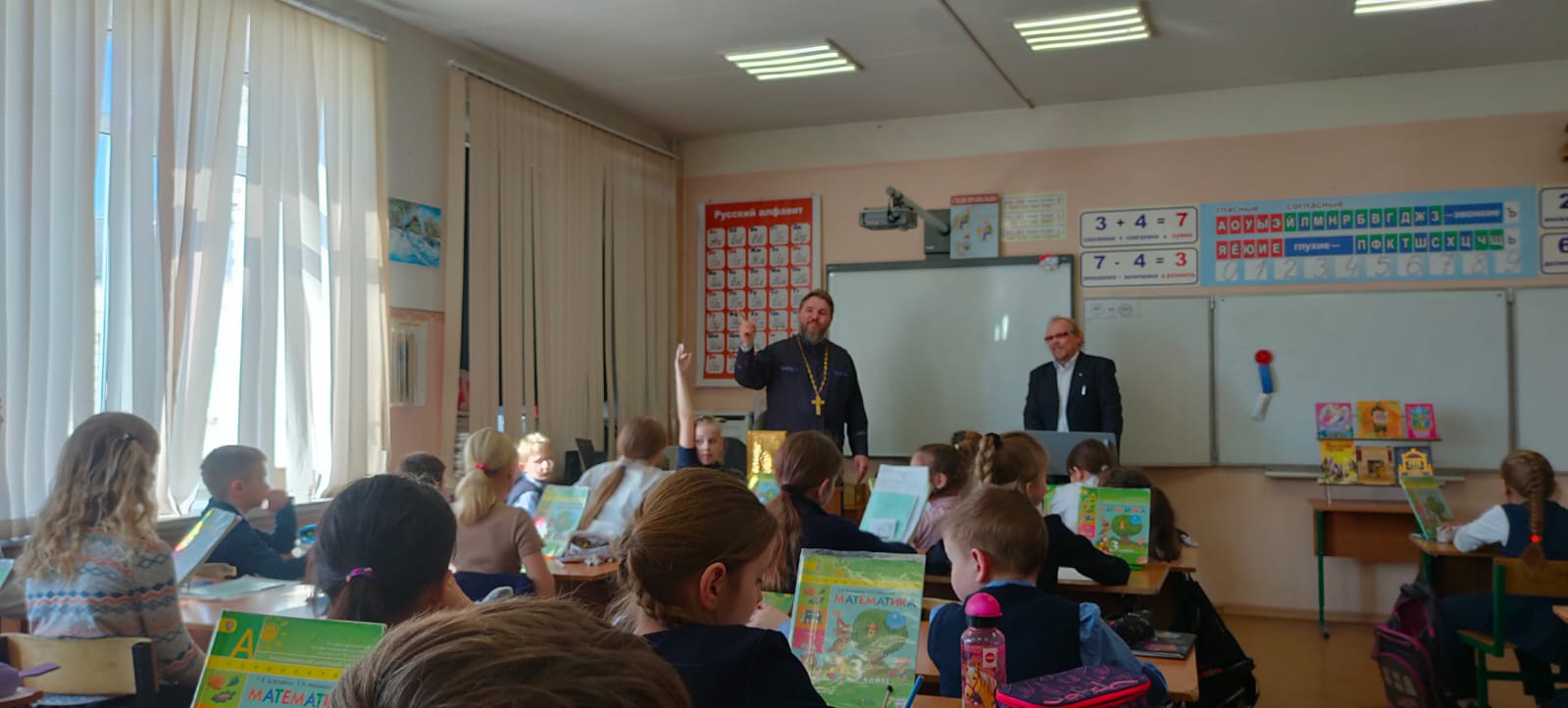 23 марта 2023г. в рамках празднования Дня Православной книги совместно с МУК ЖМЦБ им. Н.Н.Ремизова иерей Александр Гольцов настоятель храма Тихвинской иконы Божией Матери в г. Жуков и преподаватель воскресной школы Нежданов Игорь Александрович, встретились с учениками 3 А класса МОУ СОШ № 1 им. С.Ф.Романова.