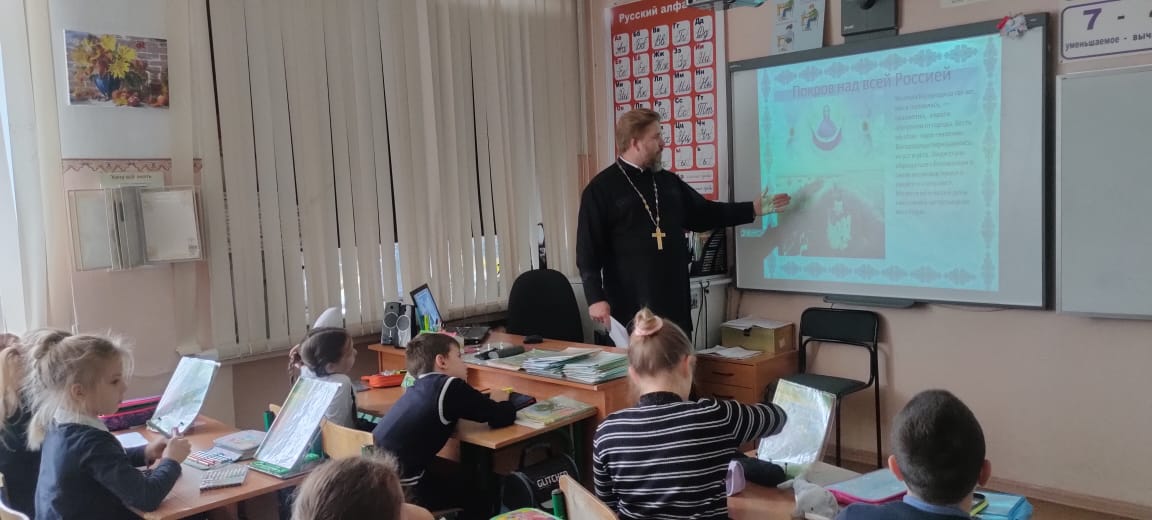 В это раз отец Александр побеседовал о наступающем двунадесятом празднике Покрова Божией Матери. Рассматривая с детьми икону праздника, батюшка рассказал детям о Покрове Богородицы, показывая наглядно, что такое омофор, или тот самый Покров, который стал символом заступничества Пречистой Богородицы и который Она сняла с головы и распростерла над молящимися во Влахернском храме. А также пояснить, что вероятно, именно такой Она предстала перед народом и увидевшим Ее святым Андреем. Икона Пресвятой Богородицы объединила все и мир небесный, и мир земной. Матерь Божия держит в руках своих покров и он такой большой, что свободно покрывает весь православный мир, всех православных людей. Ребята узнали, что в этот день верующие радуются не далеким историческим победам, а тому, что эти победы послужили примером того, как Матерь Божья слышит каждого обратившегося к Ней и спешит на помощь.