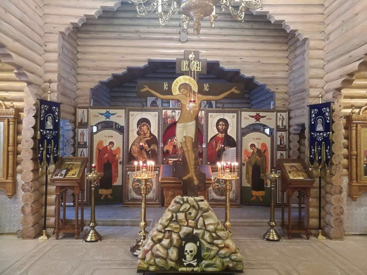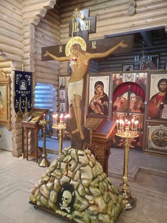 В 2019 году силами прихожан и многих верующих были собраны средства для изготовления Голгофы для храма. И вот Голгофа, пройдя множество искушений была изготовлена и доставлена в храм. Совершив освящение и окропив всех собравшихся святой водой, о.Александр отслужил благодарственный молебен, помянув всех участвующих в этом благом деле, он обратился к собравшимся со словом: «Сегодня мы собрались здесь для того, чтобы поблагодарить Бога. Мы установили Голгофу и Крест в знак памяти о том, что сделал для нас Господь. Он сошел с небес ради нас и взошел на Крест ради нас. Господь заповедовал взять крест свой и идти. Крест — это скорби, труды и болезни, которые несет каждый человек. Христов крест — спасителен и является залогом нашего воскресения. Вот почему на гробах и могилах мы ставим крест. Это победа над смертью, адом, дьяволом и миром растворенного зла, в котором мы пребываем. Голгофа и величайший подвиг, который был совершен на ней, живет не только в сердцах верующих, не только на страницах древних хроник, но и в безмолвных камнях. Но таких ли уж безмолвных? Нет! Эти камни имеют свой голос и если мы прислушаемся к ним, то через суету многолюдного и разноязыкого современного мира сможем услышать их удивительный рассказ о великой трагедии, и в то же время, о величайшей победе, имевшей место более 2000 лет назад в Иерусалиме.
