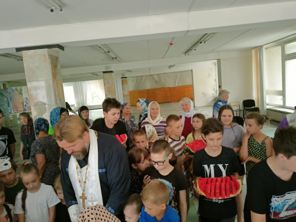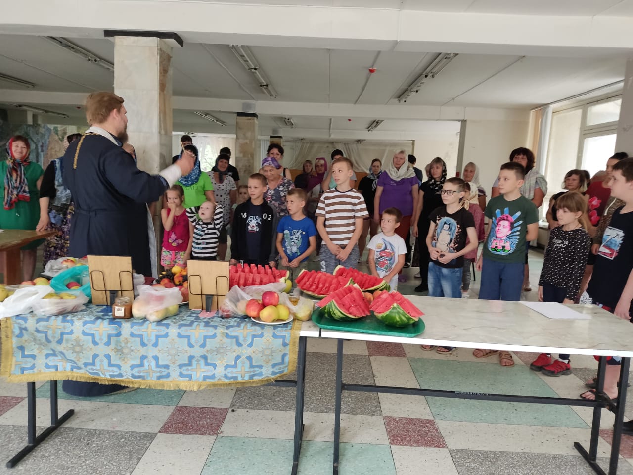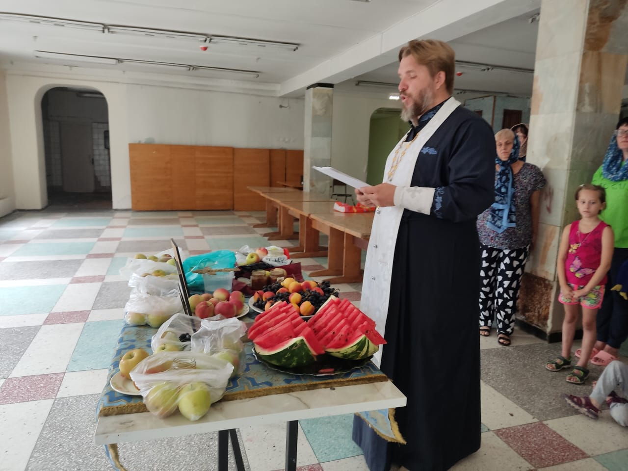 Православные христиане сегодня 19 августа 2022г. отмечают один из 12 главных церковных праздников — Преображение Господне. В храме Тихвинской иконы Божией Матери настоятель храма иерей Александр Гольцов в этот день совершил Божественную литургию и водосвятный молебен, а затем он с освященными фруктами посетил беженцев с Донбасса в лагере Галактика.