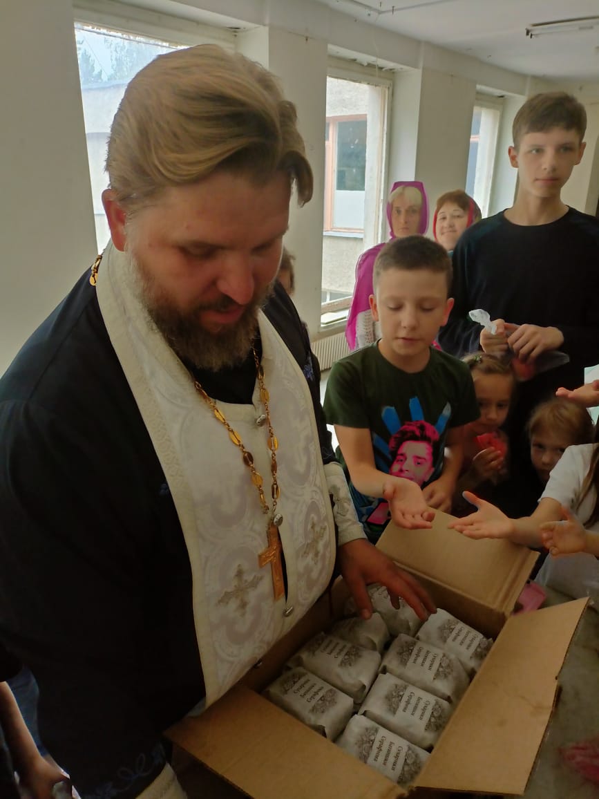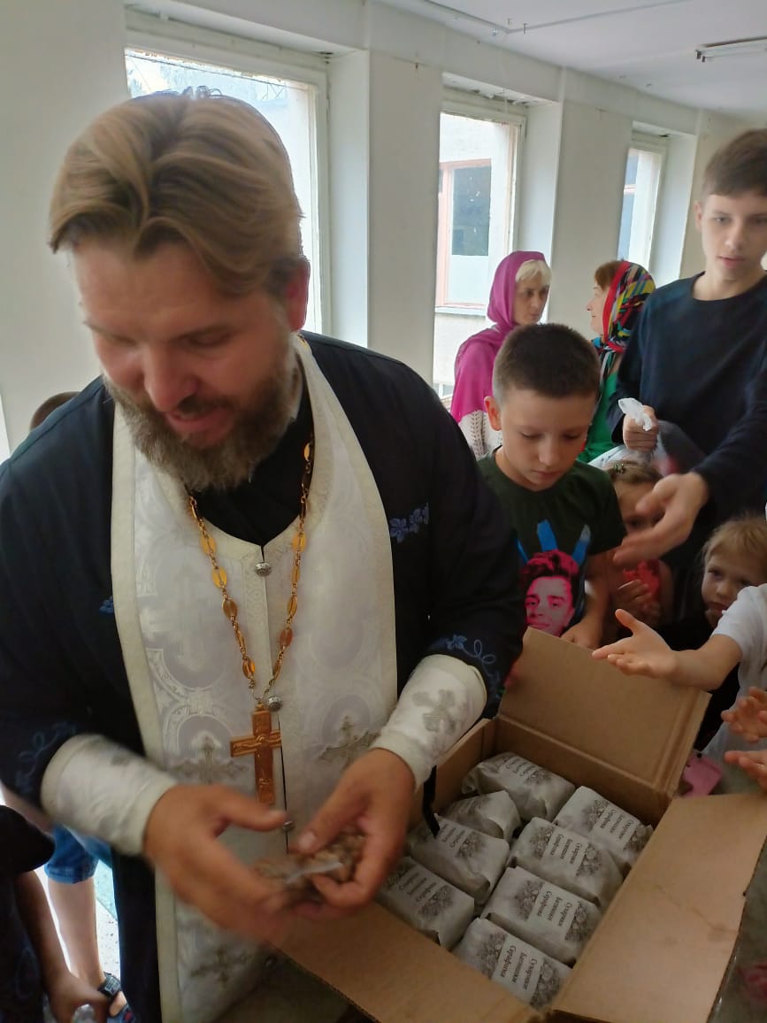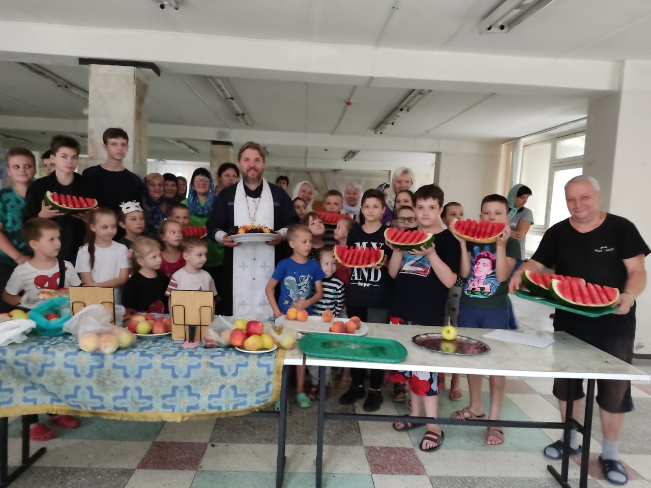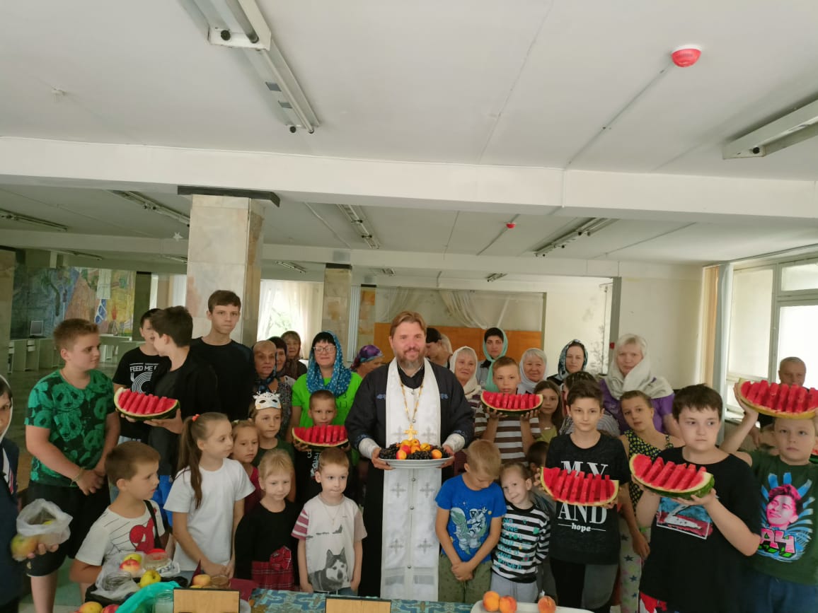 Православные христиане сегодня 19 августа 2022г. отмечают один из 12 главных церковных праздников — Преображение Господне. В храме Тихвинской иконы Божией Матери настоятель храма иерей Александр Гольцов в этот день совершил Божественную литургию и водосвятный молебен, а затем он с освященными фруктами посетил беженцев с Донбасса в лагере Галактика.