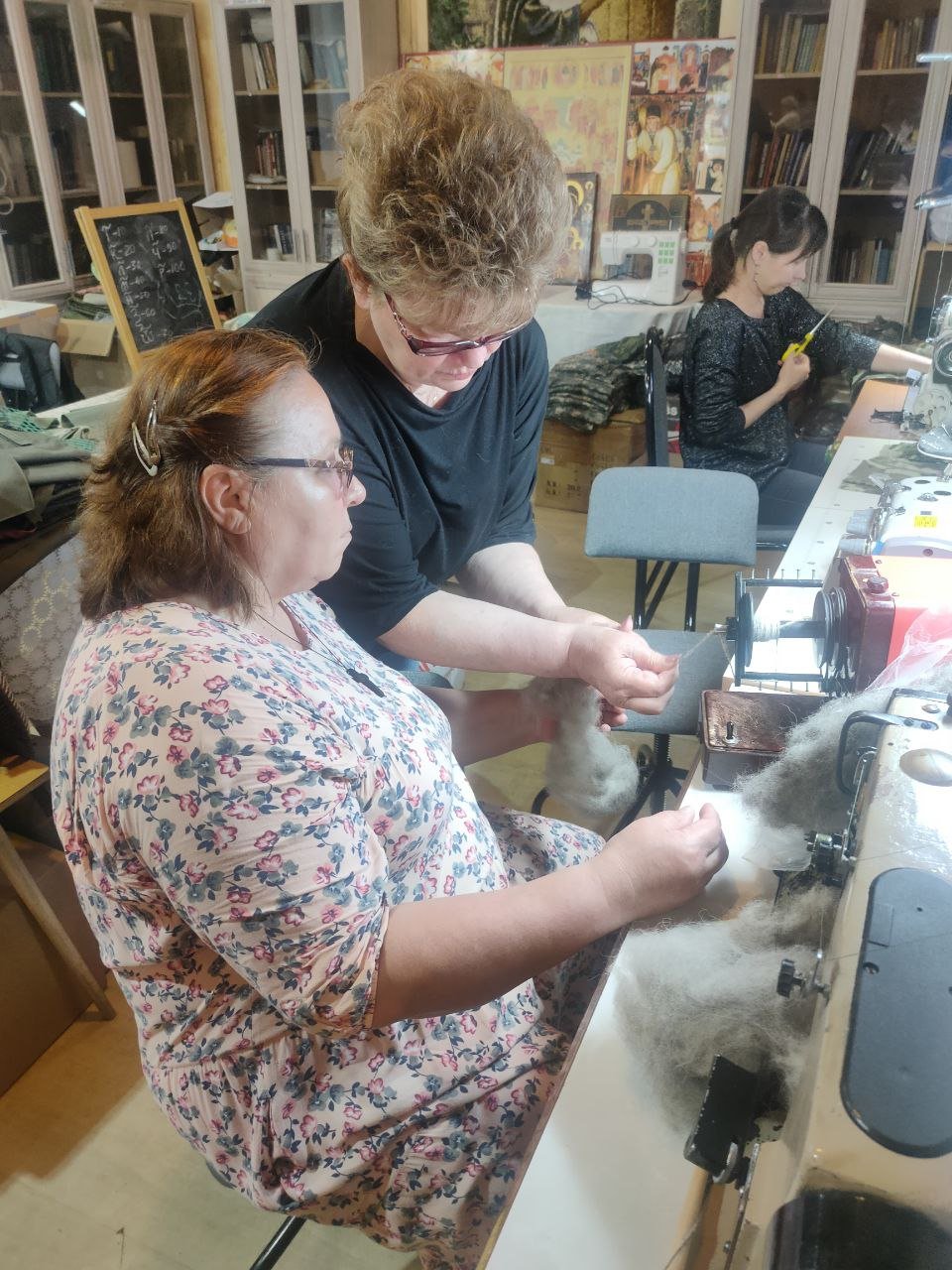 При храме волонтеры развивают несколько направлений шьют балаклавы, флисовые кофты, трусы для госпиталя, теплые костюмы, пятиточечники и многие другие необходимы вещи. Так же при храме развивается плетение маскировочных сетей и маскировки для спецподразделений. Если вы желаете научиться прясть из собачьей шерсти и этому вас научат и вы своими руками можете приготовить материал для будущих теплых носков и поясов, которые очень востребованы будут в холодное время.