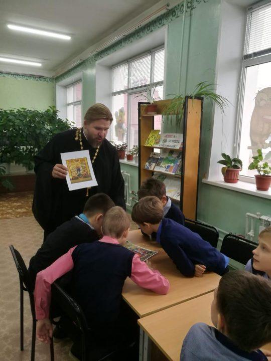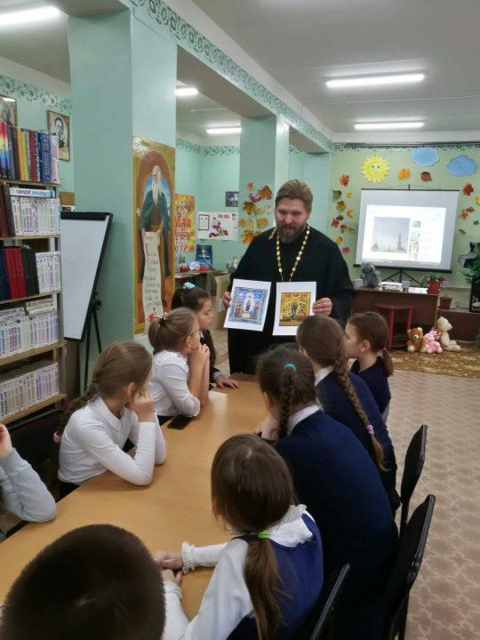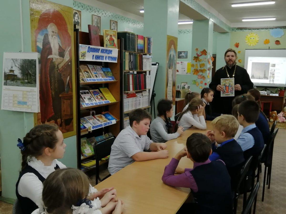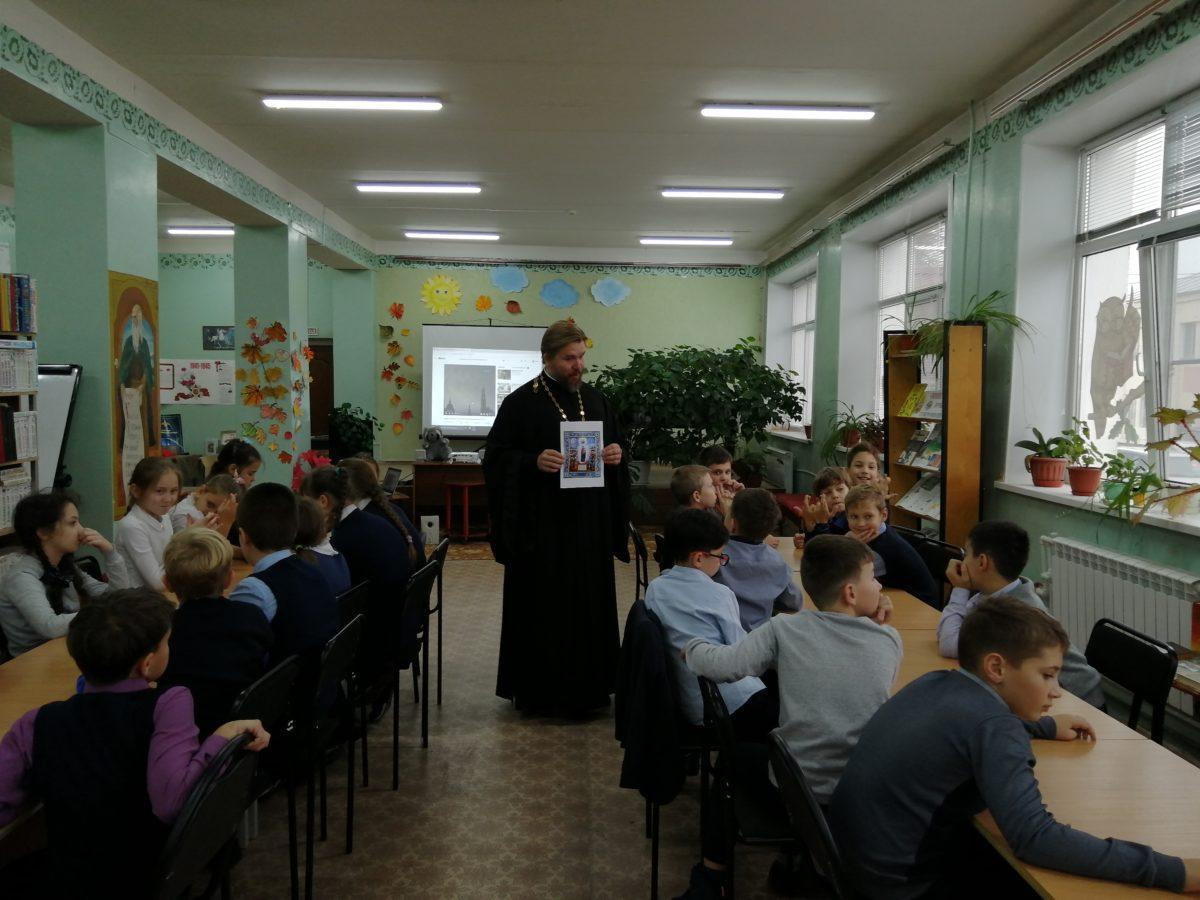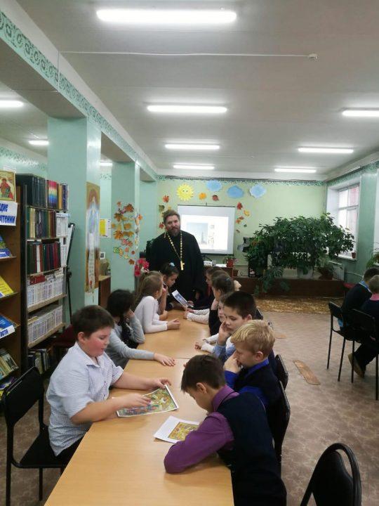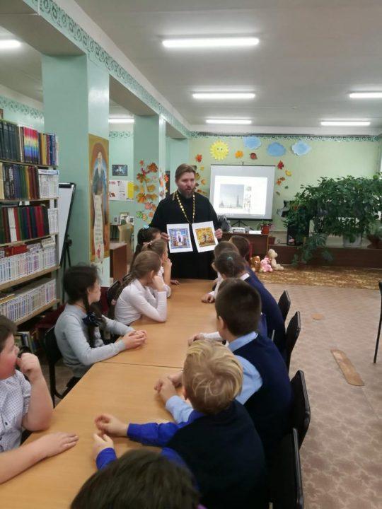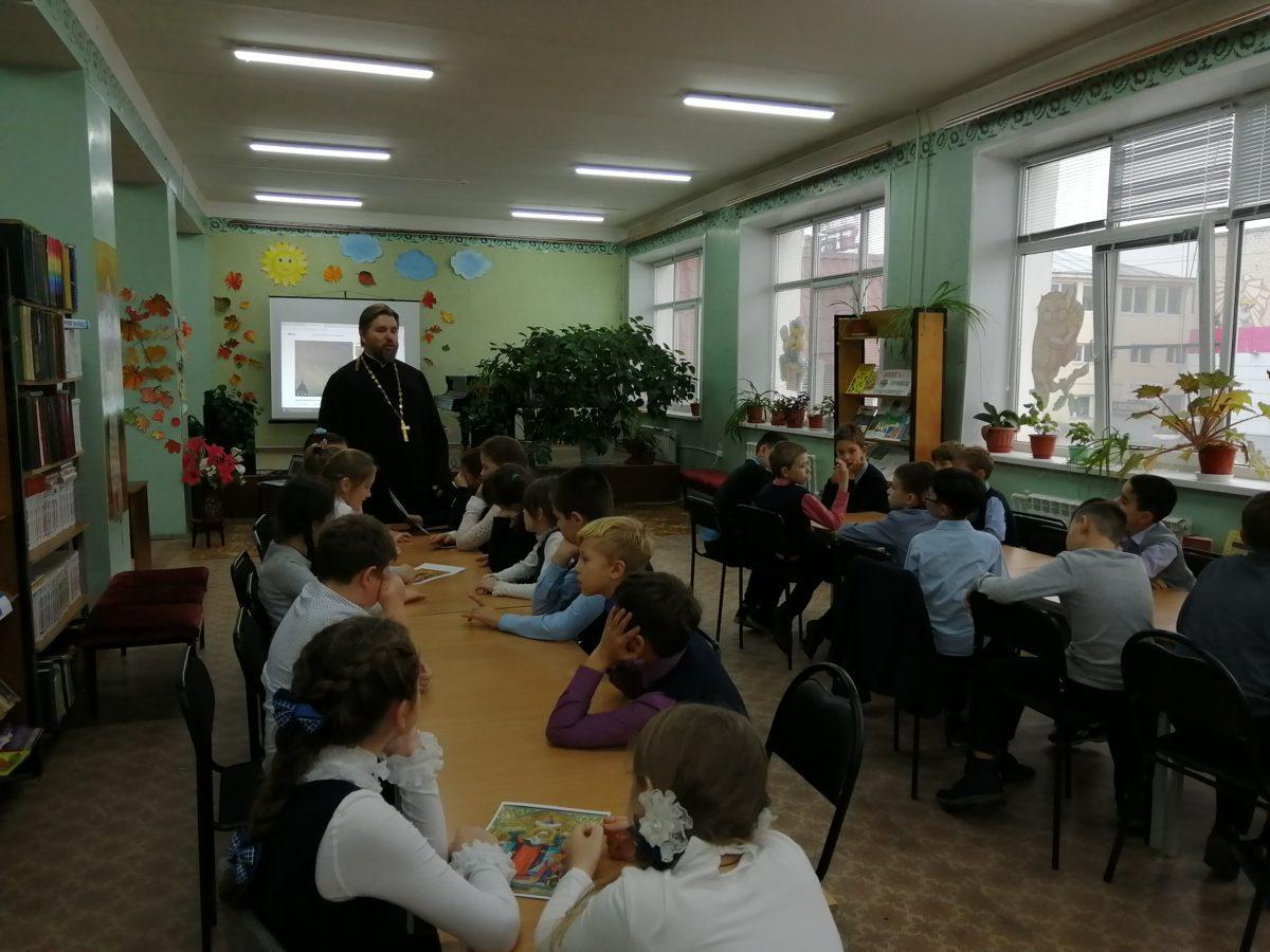 05 ноября 2019 г. в МУК ЖМЦБ им. Н.Н.Ремизова состоялась очередная встреча настоятеля храма Тихвинской иконы Божией Матери в г.Жуков иерея Александра Гольцова с учениками четвертого класса Жуковской школы № 1 им. Н.С. Романова.